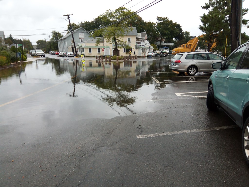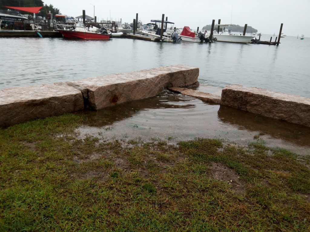 These pictures document flooding at the boat launching ramp across from the Stony Creek post office. The upper left photo was taken was at a full moon tide, April 18, 2018 . Flooding occurs when high tides from either full or new moons are augmented by east winds, such as from a nor’easter, which drive a rising tidal surge westward from the eastern end of Long Island Sound at the Race. So-called nuisance coastal flood frequency has increased significantly, from a few times every couple years to several times a year due to rising sea levels. Lunar tidal extremes also occur at new moons, and the other photos are from September 9, 2018, when the high tides reached 7 feet above the mean-low-tide mark, 2 feet above normal.